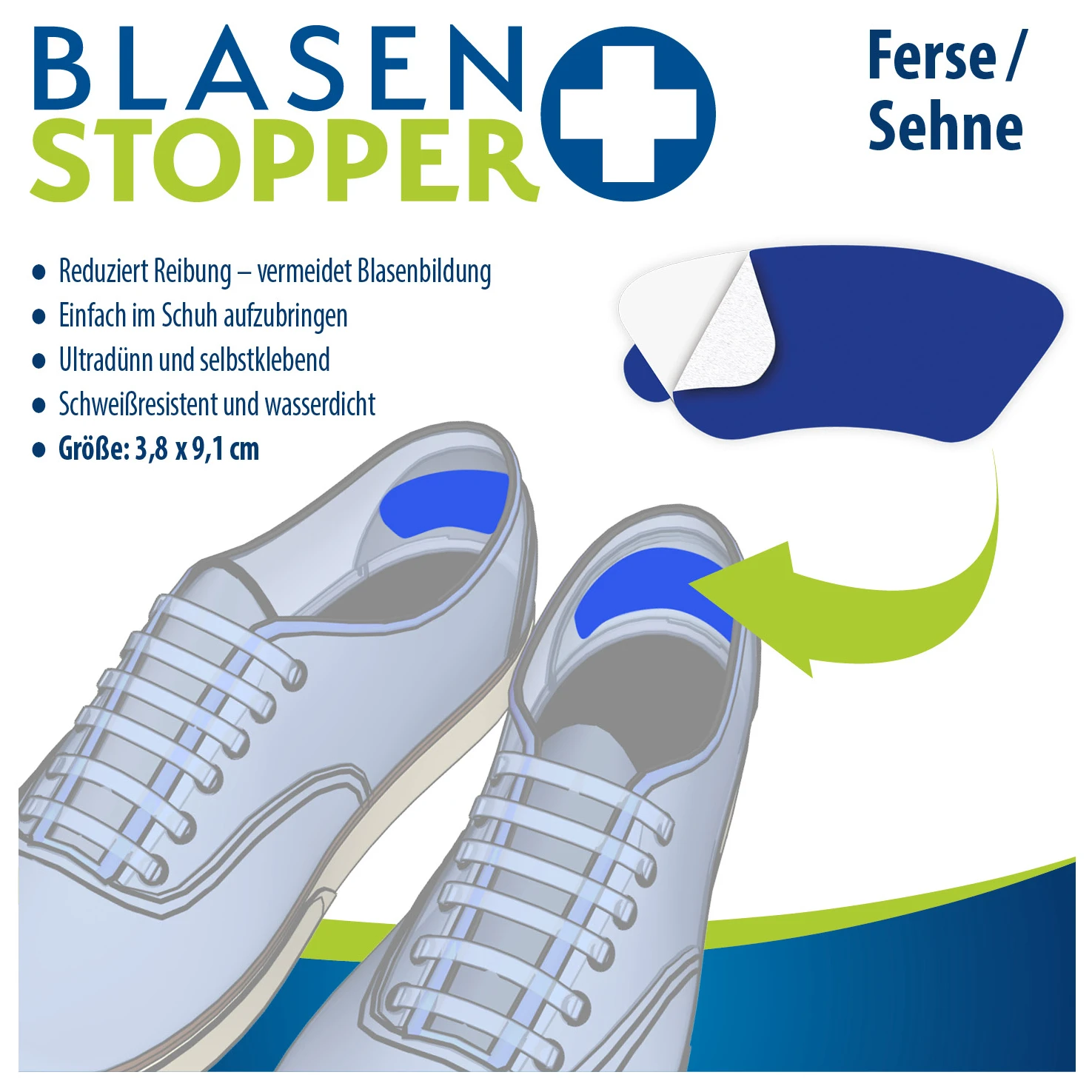 Gib Blasen keine Chance und verwende die Blasenstoppper Bogen für Ferse/Sehne. Diese selbstklebenden Blasenstopper werden im Schuh angebracht und reduzieren dort gezielt Reibung, wodurch sich erst gar keine Blasen bilden. Dank ihrer schweißresistenten und wasserdichten Eigenschaft verrutschen sie nicht und haben den ganzen Tag über einen optimalen Halt.