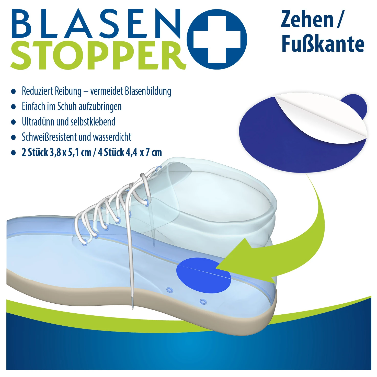 Gib Blasen keine Chance und verwende die Blasenstoppper Ovale für Zehen/Fusskante. Diese selbstklebenden Blasenstopper werden im Schuh angebracht und reduzieren dort gezielt Reibung, wodurch sich erst gar keine Blasen bilden. Dank ihrer schweißresistenten und wasserdichten Eigenschaft verrutschen sie nicht und haben den ganzen Tag über einen optimalen Halt.