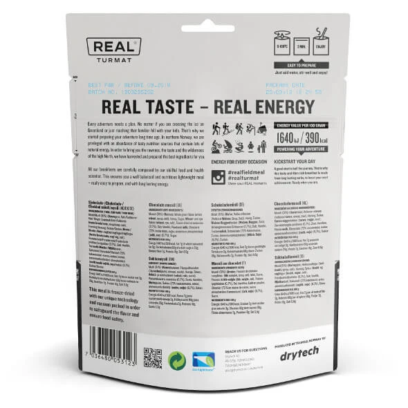 Für den süßen Zahn am frühen Morgen gibt’s das Schokoladenmüsli von Real Turmat. Verfeinert mit Honig und gefriergetrockneten Erdbeeren bleiben hier keine Wünsche übrig. Ein klasse Start in den Tag! Zutaten: Müsli (Hafer, Vollkornflocken (Vollkorn-Weizen, Sirup, Salz), Honig, Zucker, Weizen-Roggenflocken (Weizen, Roggen, Salz), Gefriergetrocknete Erdbeeren (1,5%), Salz, Vanillin) (61%), Trockenmilch, Schokolade (Kakaomasse, Zucker, fettarmer Kakaopulver, Kokosnussbutter, Emulgator (E322 Sojalezithin), Vanille Aroma) (10%), Zucker.Den Packungsinhalt mit 240 ml heißem Wasser aufgießen. Umrühren, Zipper schließen, dann 3 min warten.