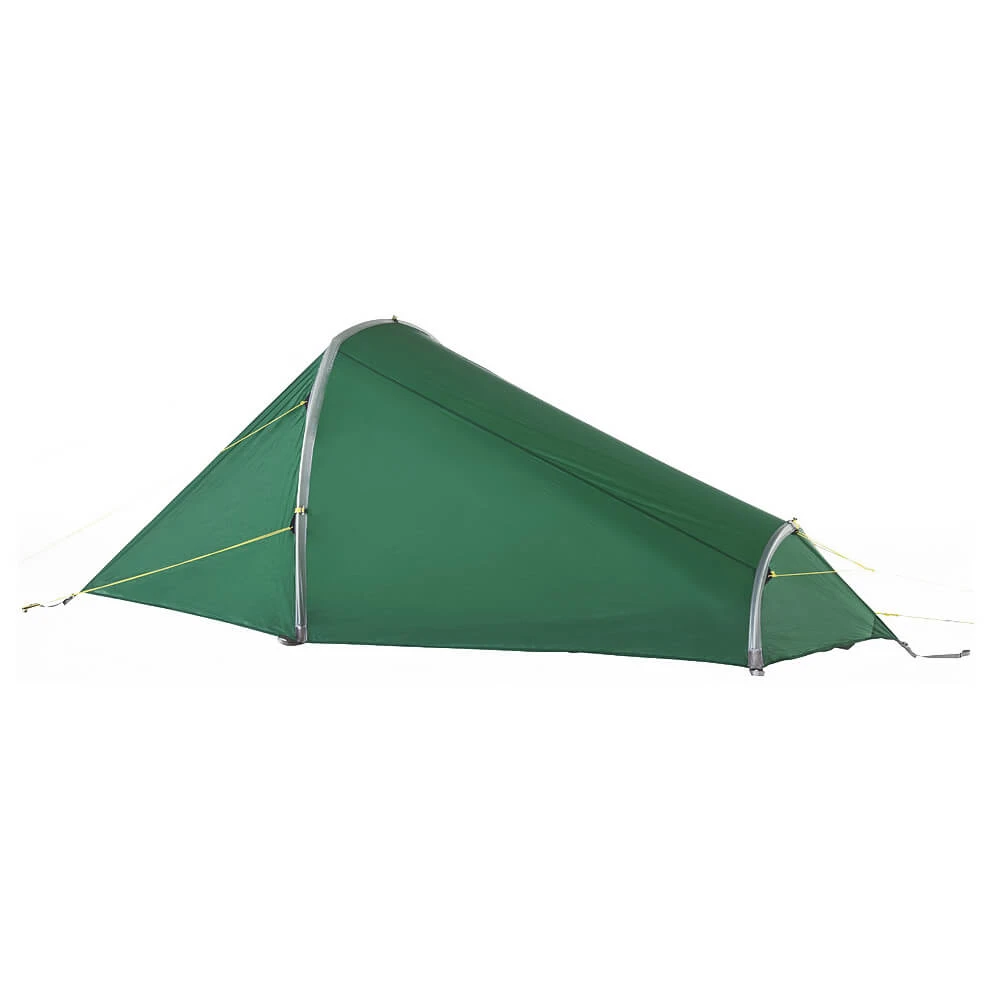 Das Kyrkja 1 Personenzelt von Tatonka ist eine sehr leichte und klein packbare Camping- und Trekking-Solotouren-Unterkunft. Das Tunnelzelt mit Seiteneingang und Apside hat einen zweiten Gestängebogen, der es auch langen Outdoorern ermöglicht, ausgestreckt zu schlafen. Das Kyrkja ist mit seinem ultraleichten Scandium Gestänge schnell und einfach aufgebaut, da Innen- und Außenzelt miteinander gekoppelt sind. Verstärkte Eckpunkte mit Gurtbandschlaufen sorgen dabei für Stabilität und Haltbarkeit. Sollte es beim Abbau regnen, lässt sich das Innenzelt auch aushängen und trocken verstauen. Beim nächsten Aufbau wird dann zunächst das Außenzelt aufgestellt und anschließend das trockene Innenzelt eingehängt.Für angenehm trockenes Innenklima sorgt das Außenzelt aus äußerst reißfestem, 5-fach silikonbeschichtetem Nylon 6.6 Ripstop-Gewebe. Der wasserdichte Zeltboden aus PU-beschichtetem Nylon schützt mit einer Wassersäule von 10.000 mm optimal vor Nässe von unten. Das Innenzelt sorgt mit einem Lüfter für ausreichend Ventilation. Da die Apsis genug Platz für den Trekkingrucksack und andere Ausrüstung bietet, kann man es sich drinnen durchaus gemütlich machen. Die integrierte Wäscheleine im Innenraum sorgt für trockene Socken und hilft beim Ordnung halten. Wer Gewicht und Packmaß minimal halten will, ohne auf verlässliche Robustheit zu verzichten, ist mit dem Kyrkja 1 Personen Zelt von Tatonka bestens versorgt!